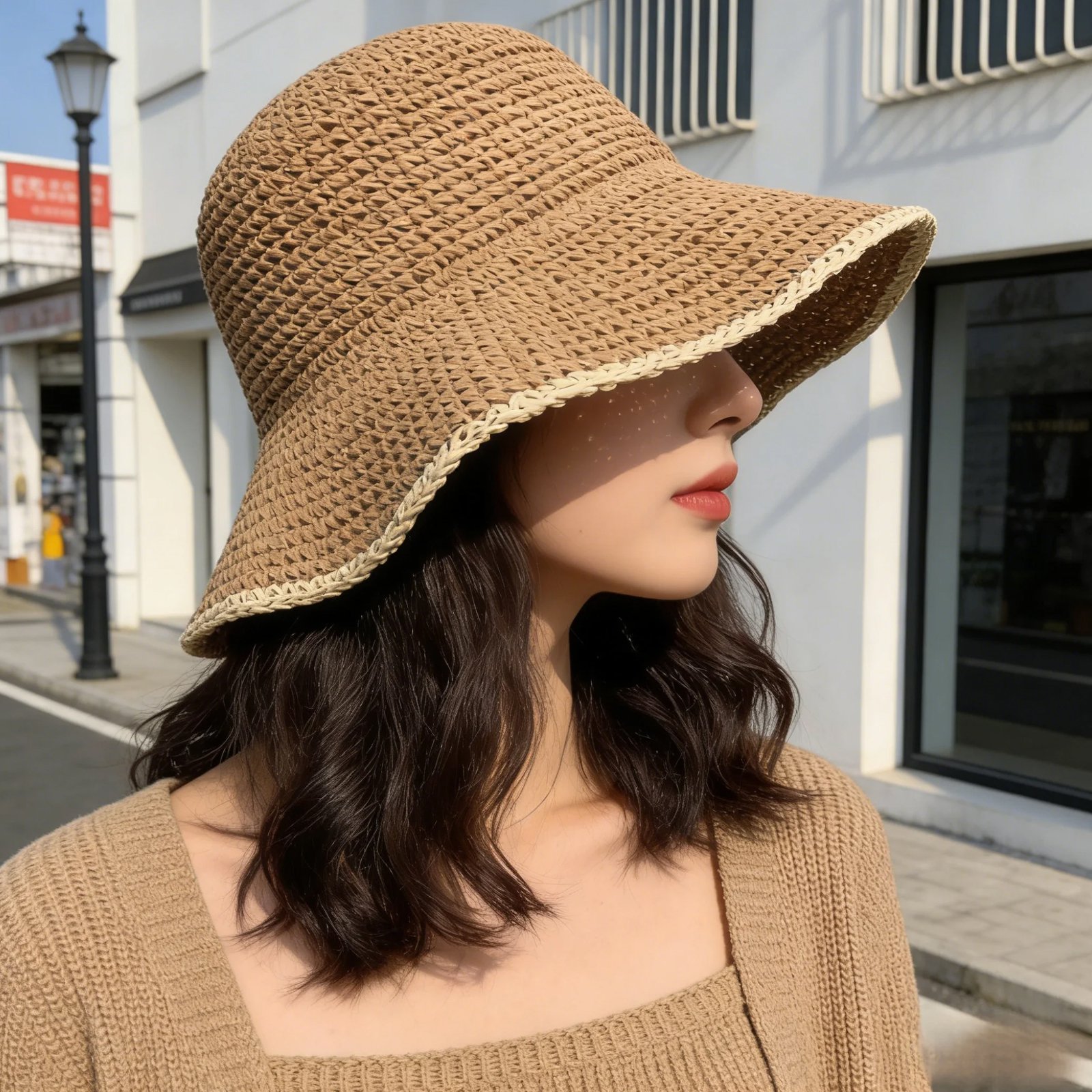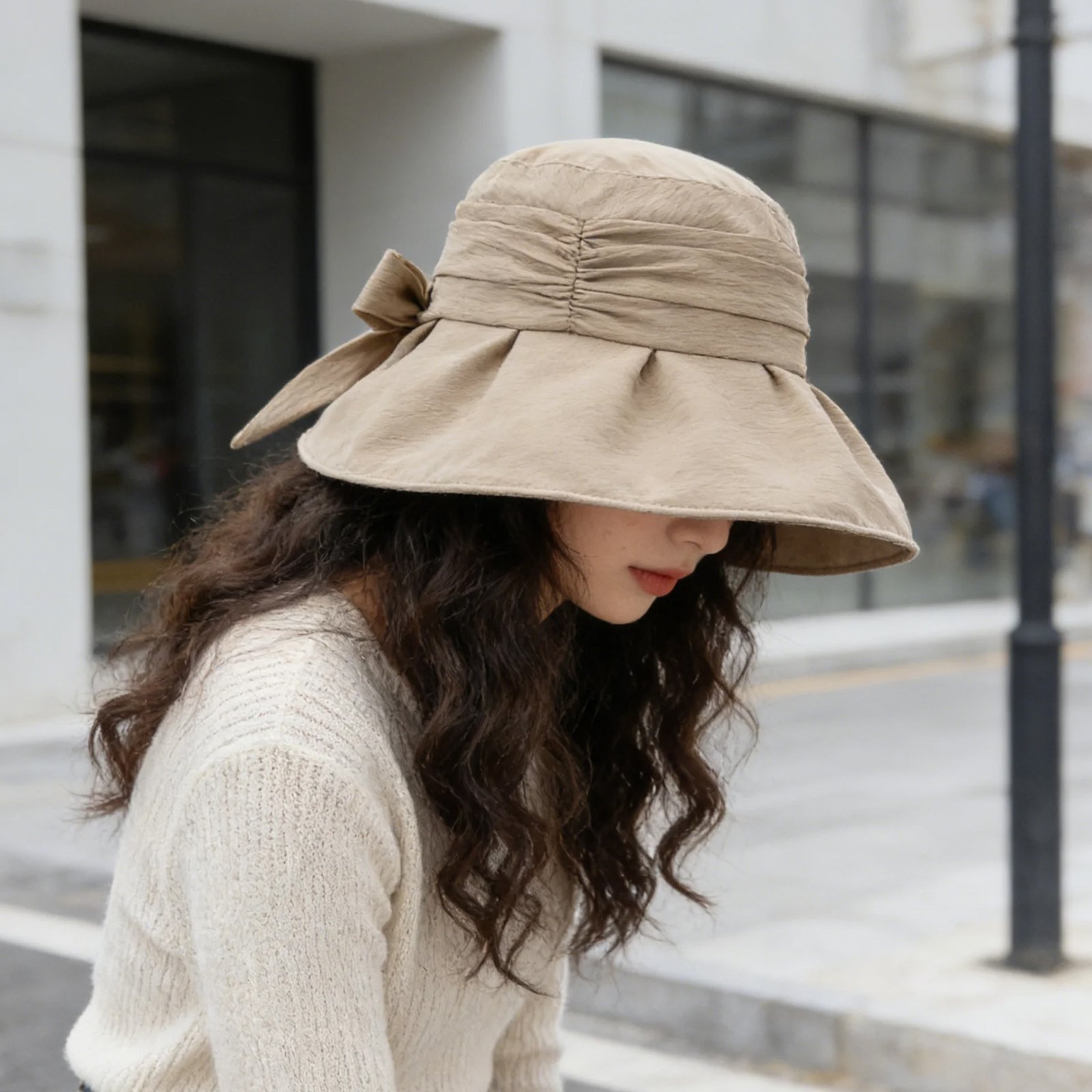 여성용 넓은 챙 접이식 리본 장식 썬햇